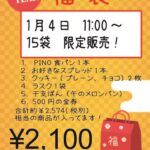 - 【1月4日初売り 限定15袋 福袋販売します】昨日は福袋の先行予約販売にたくさんのお申込みをいただき、ありがとうございました。なんと、15分で完売しました。あまりの反響に、ビックリしましたご予約の分とは内容が一部違いますが、当日販売分も15袋限定にてご用意いたします内容は下記のようになります。1、PINO食パン 1本¥4402、お好きなスプレッド 1本¥6943、クッキー(プレーン、チョコ) 2枚¥4604、ラスク 1袋¥2605、午の干支メロンパン 1個¥2206、500円分の金券 1枚¥500合計¥2,574(税別)分の商品が入っていて、¥2,100(税別)、¥2,268(税込) にての販売です! 1月4日(日 )11:00~17:00の販売となります。ご都合が合うようであれば、ぜひご来店ください。2026年初売り!皆様のご来店、お待ちしております。※こちらは1月4日当日販売分のため、予約の受付はいたしておりません。