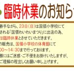 - 誠に勝手ながら、23日(日)は国領小学校にて開催される「国領わいわいまつり」に出店の為、店舗は臨時休業とさせていただきます。 パンの販売は、国領小学校の体育館にて 10:00~14:30まで行っております。お客様にはご迷惑・ご不便をお掛けいたしますが、何卒ご理解の程宜しくお願い申し上げます。