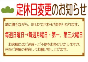 平素は当店をご利用いただき、誠にありがとうございます。 誠に勝手ながら、3月より定休日を変更させていただきます。 毎週日曜日 → 毎週月曜日,第一・第三火曜日 第1週・第3週は月曜日・火曜日と連休となります。 お客様には […]