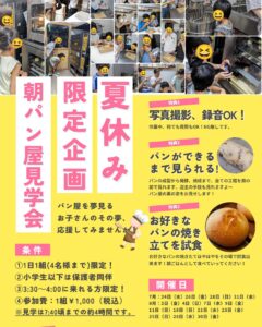 こんばんは!PINO松林です。本日、19:00より予約を開始した、夏休み特別企画!「パン屋の朝の仕事を見学してみよう!」ですが、ありがとうございます1時間で全ての枠が埋まりましたちょっと自分でもビックリで、驚いてます。朝3:30〜4:00に集合だなんて、厳しいのに本当に感謝です!ありがとうございますみんなで、全力でお子さんの夢を応援します即完が早すぎたので、スケジュールを見直してなんとか追加出来ないかも考えます️プラスして、夏休み特別企画の第二弾もやりますほぼ内容も完成しました!こちらもお子さんの夢を応援する企画です!来週発表しますので、お楽しみに〜!この度はありがとうございました