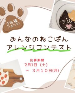 猫好き大集合!🐈2月はにゃん月!🐈「ねこぱん大作戦2025」開催します!「もっちりねこ食ぱん」をゲットして「ねこぱんアレンジコンテスト」に応募してね!みなさんの大好きな「ねこちゃん」をチョコペンやジャム等を使って、表現してください!ぜひみなさんのねこ愛を、ねこ食ぱんにぶつけてください2月限定!「もっちりねこ食ぱん」と「ねこクッキー」を販売します。お買い上げいただいた売り上げの一部を保護ねこ団体「保護猫広場ラブとハッピー」さんへ寄付します。楽しく、美味しく食べて、さらには保護ねこちゃん達を助けられたら良いなと思います。ねこ好きの方々は喜ぶと思いますので、ねこ好きのお友達にも教えてあげてください!#pino #パン #パン屋 #調布 #国領 #調布パン屋#バゲット #bread #bakery #京王線 #無添加パン#おいしいパン #おいしいパン屋さん #食パン#クリームパン #国産小麦 #パン好きな人と繋がりたい#猫ぱん #ねこぱん大作戦2025