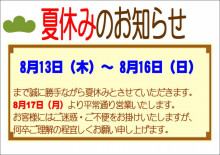 平素は当店をご利用いただき、誠にありがとうございます。 誠に勝手ながら、8月13日(木)~16日(日)まで夏休みとさせていただきます。お客様にはご不便、ご迷惑をお掛け致しますが、ご理解のほど何卒よろしくお願いいたします。 […]